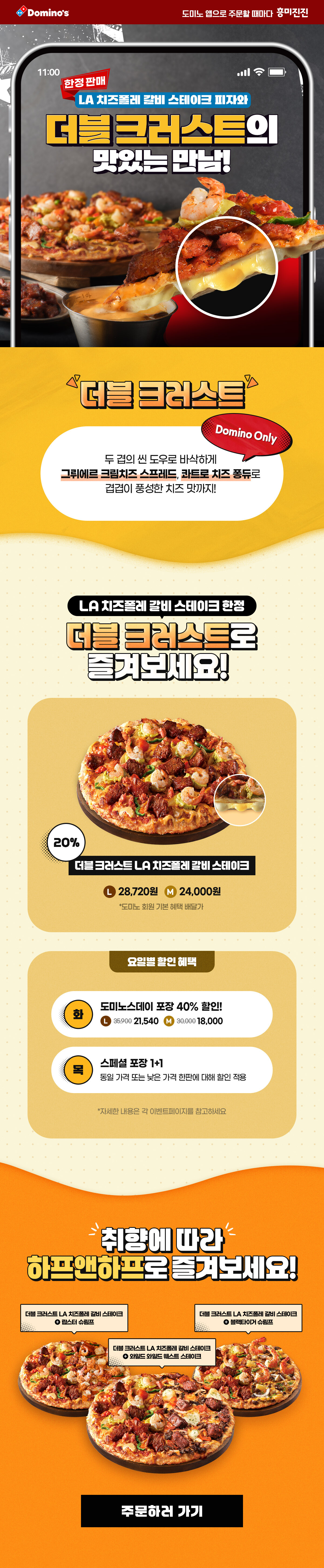 이벤트 제휴이벤트 LA 치즈폴레 갈비 스테이크 피자 한정 더블 크러스트 출시! 2026-01-02 ~ 2026-03-02 유의사항 자세한 유의사항 및 프로모션 미진행 매장은 이벤트 페이지 하단 유의사항을 참고해 주세요. 목록보기